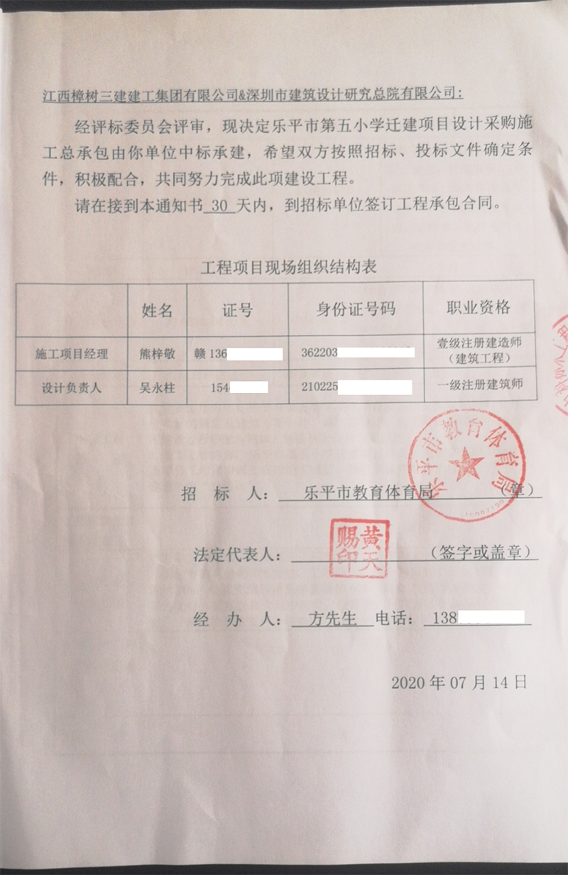 近日,从江西樟树三建建工集团景德镇分公司传来喜讯,由樟树三建景德镇分公司联合深圳市建筑设计研究总院有限公司投标的“乐平市第五小学迁建项目设计采购施工总承包(EPC)”项目成功中标,中标金额6384.04万元。